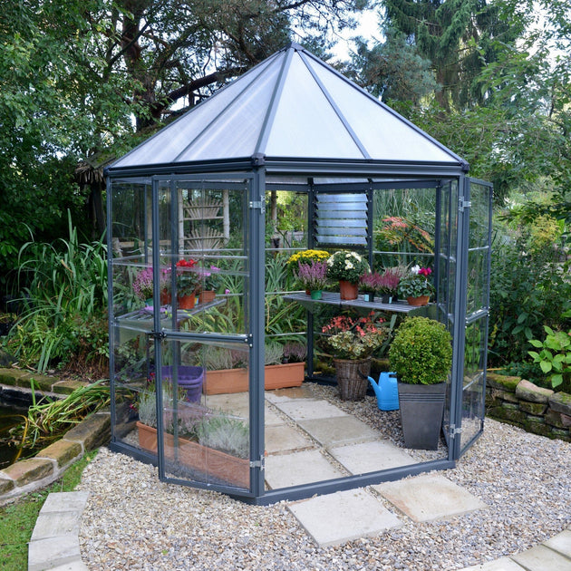 Palram - Canopia | 7x8 Ft Oasis Hex Greenhouse Kit - Gray With 0.8mm Polycarbonate Glazing
